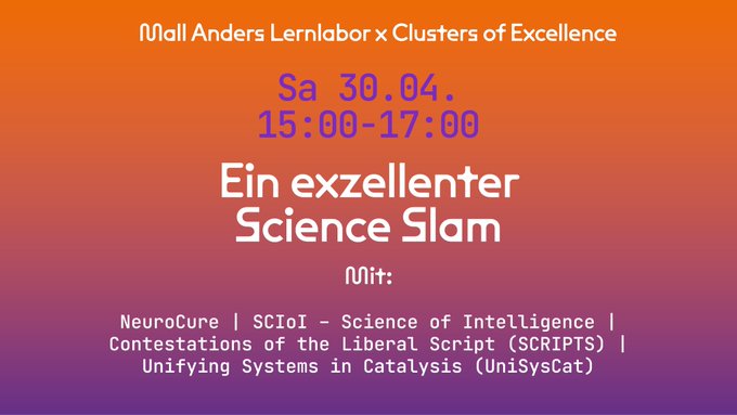 Prepare for an extraordinary Science Slam! Young scientists from four Clusters of Excellence of the Berlin University Alliance present their research work in the learning lab Mall Anders in the Wilma Shoppen mall. They only have 15 minutes to present, and everything is allowed: costumes, props, movies, PowerPoint presentations or experimental setups. After the presentations, the audience can meet the slammers and have a few drinks with them.