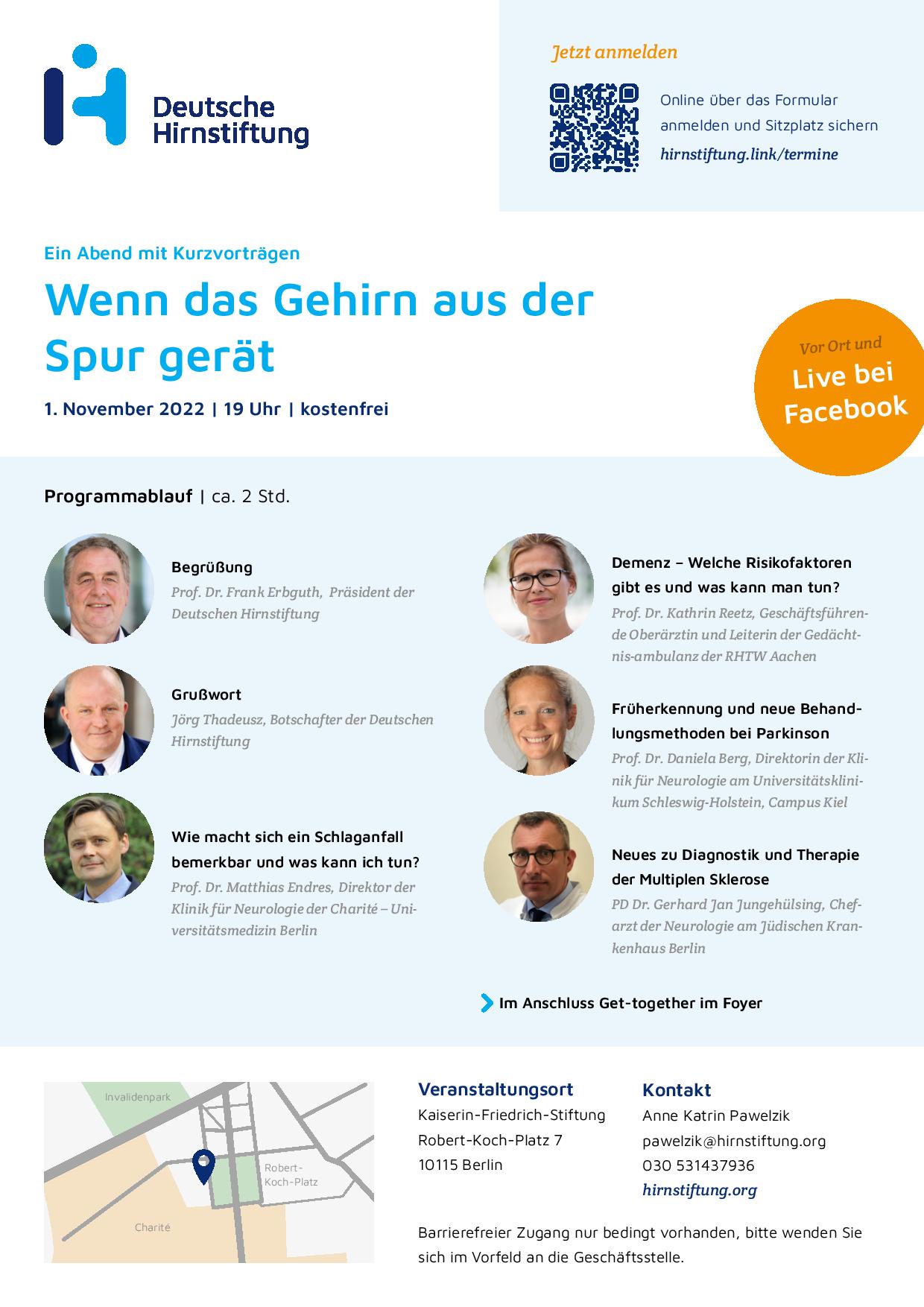Die Veranstaltung ist kostenlos - melden Sie sich an und sichern Sie sich Ihren Sitzplatz. Im Anschluss laden wir Sie zu einem Get-together ins Foyer ein. Weitere Informationen finden Sie unter https://hirnstiftung.org/veranstaltungen/gehirn-aus-der-spur/